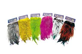 - Pluma genética de atado de streamers, moscas húmedas , moscas articuladas o moscas que requieren de una pluma ancha, larga y resistente