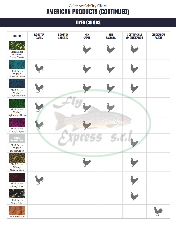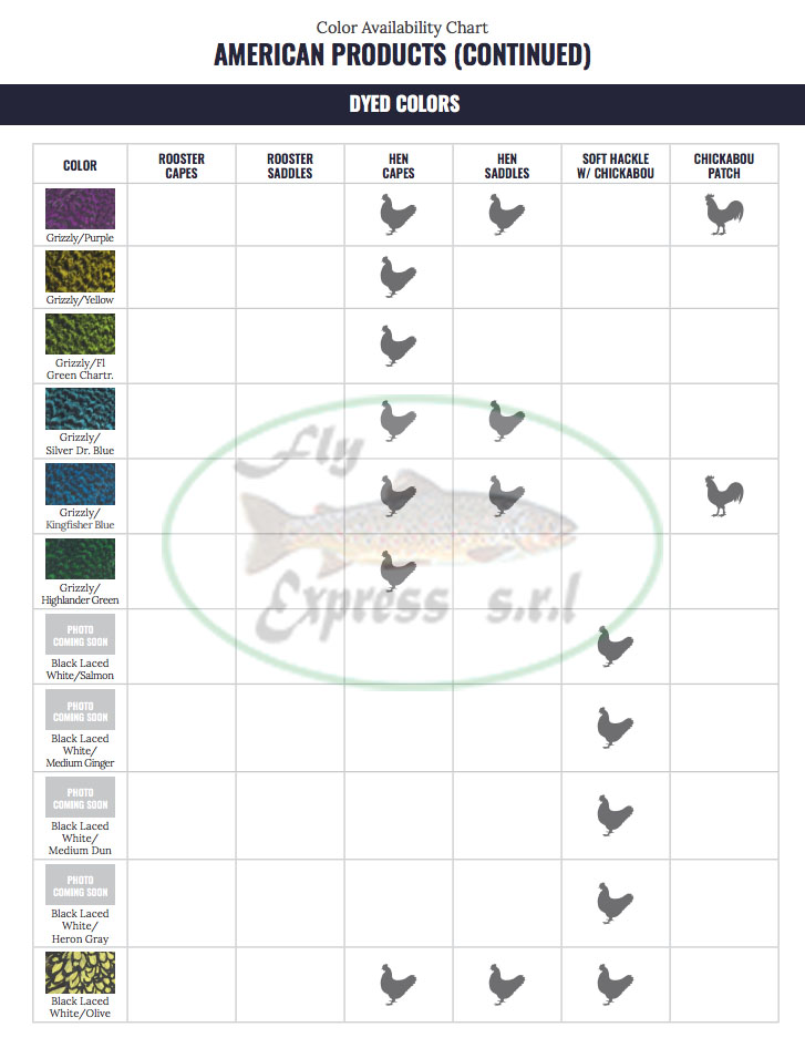 | Color American Saddle | 001 Grizzly, 002 White, 003 Brown, 004 Light Ginger, 007 Golden Bager, 008 Black, 009 Unique Variant, 017 Medium Ginger, 018 Silver Badger, 019 Black Iaced White, 020 Furnace, 134 Grizzly Dyed Olive, 139 Grizzly Dyed Dark Olive, 144 Grizzly Dyed Fl. Yellow Chartreuse, 151 Grizzly Dyed Orange, 154 Grizzly Dyed Purple, 155 Grizzly Yellow, 156 Grizzly Dyed Fl Green Chartreuse, 234 White Dyed Olive, 244 White Dyed Fl Yellow Chartreuse, 249 White Dyed Coachman Brown, 251 White Dyed Orange, 252 White Dyed Red, 254 White Dyed Purple, 255 White Dyed Yellow, 256 White dyed Fl Green Charteuse, 257 White Dyed Silver Dr. Blue, 341 Black Iaced White Dyed Shrimp Orange, 344 Black Iaced White Dyed Fl Yellow Chartreuse, 349 Black Iaced White Dyed Brown, 351 Black Iaced White Dyed Orange, 352 Black Iaced White Dyed Red, 354 Black Iaced White Dyed Purple, 355 Black Iaced White Dyed Yellow, 356 Black Iaced White Dyed Fl Green Chartreuse, 365 Black Iaced White Dyed Golden Olive |