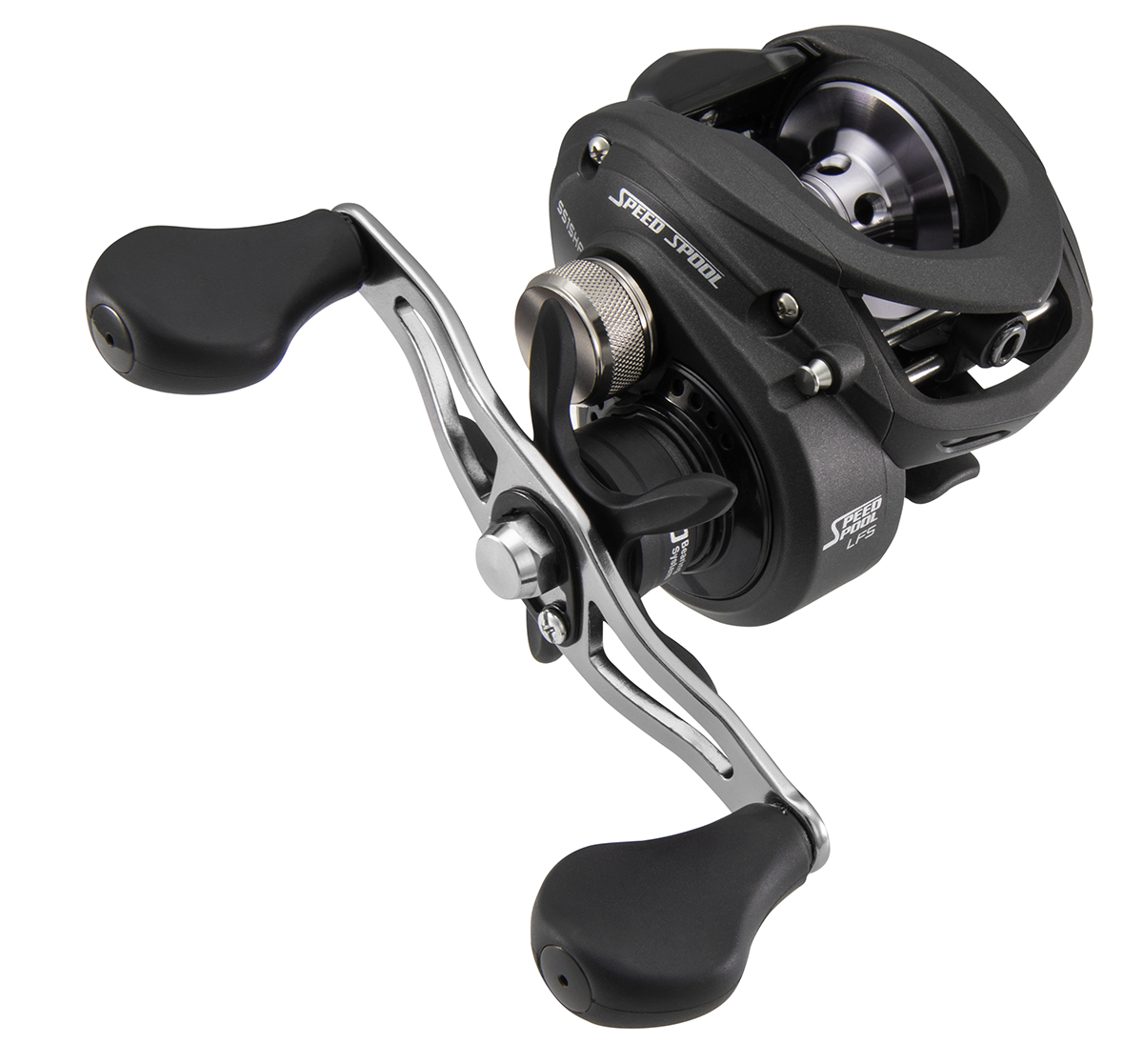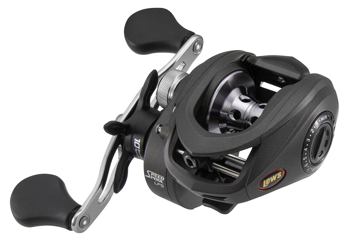 - Mango de carrete de 95 mm de aluminio anodizado arqueado con perillas de mango de paleta SoftTouch personalizadas de Lew’s®.